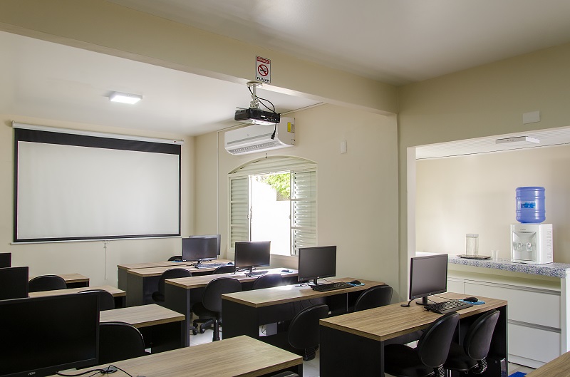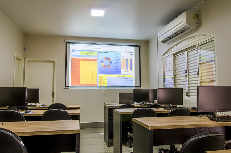 Sala de treinamento com 20 computadores conectados em rede, de última geração;